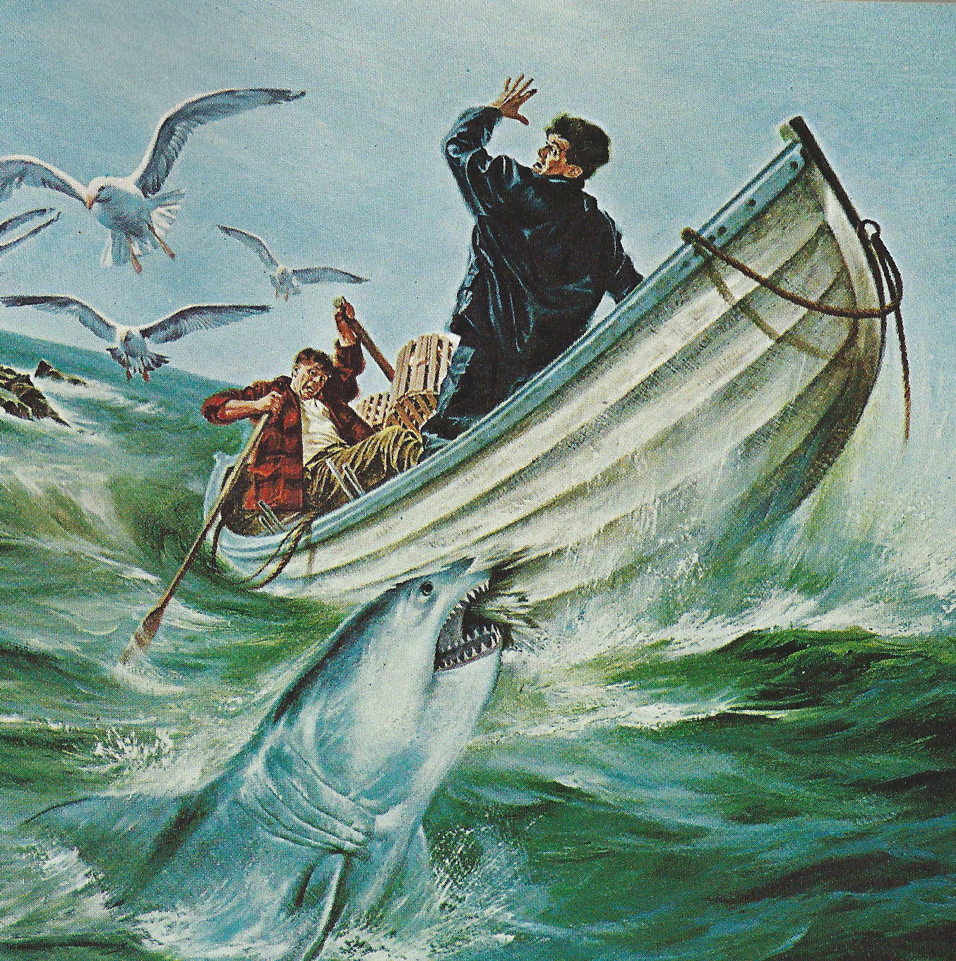 “Jaws” fans will recall the eerie, tense but oddly tender scene in which a nervous Chief Brody tries to understand the nature of the formidable creature that has “staked a claim in the waters off Amity Island” by flipping through a stack of shark books, the images of various grinning jaws and gruesome wounds reflected in his glasses. The wondrous blog Haunted Closet has lovingly catalogued and compiled all of the images from a 1968 National Geographic and books by Cousteau and others. I love the meticulous detective work of fans!