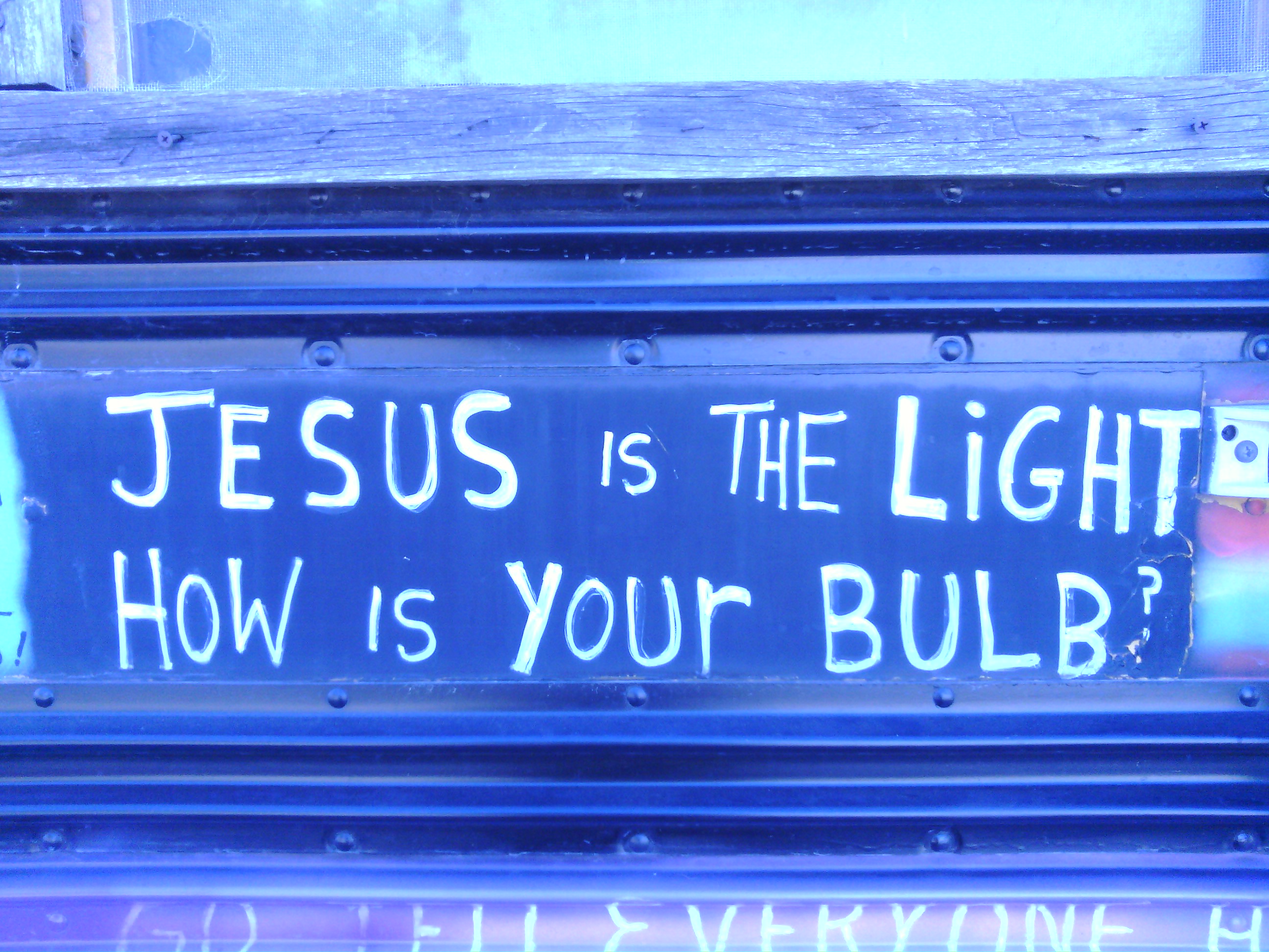 Driving down to the Seaworld, I stopped just south of the weird double-breasted San Onofre nuke plant to take in an ocean view.  As I pulled into the rest area, I saw what looked like the Partridge Family’s multi-colored bus dominating the tiny beachside lot.  Unlike the Partridge’s squeaky clean pattern, each of this bus’s colored squares contained a crazy religious messages: